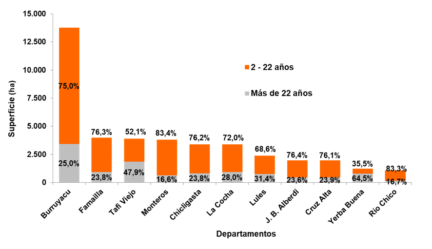 A nivel geográfico, nuestro monitoreo ha detectado disparidades significativas según la zona productiva. Los departamentos de Yerba Buena y Tafí Viejo presentan el perfil más envejecido, con un 64,5% y 47,9% de sus montes superando los 22 años, respectivamente. En contraste, las zonas con mayor dinamismo y juventud se localizan en el centro y sur de la provincia; departamentos como Monteros y Río Chico muestran los mayores porcentajes de plantaciones en rangos de 2 a 22 años, reflejando una inversión más reciente en la renovación de sus cuadros.