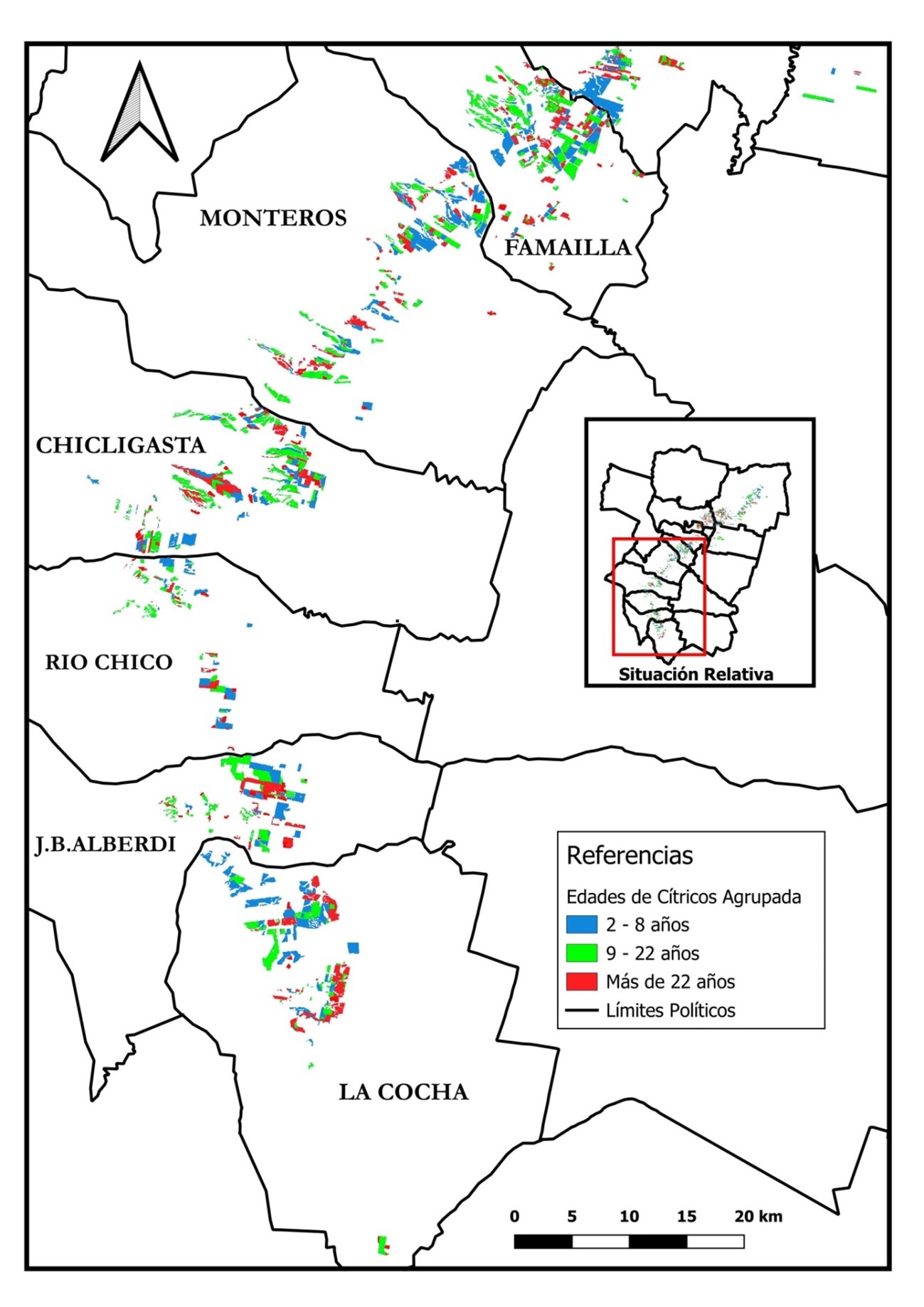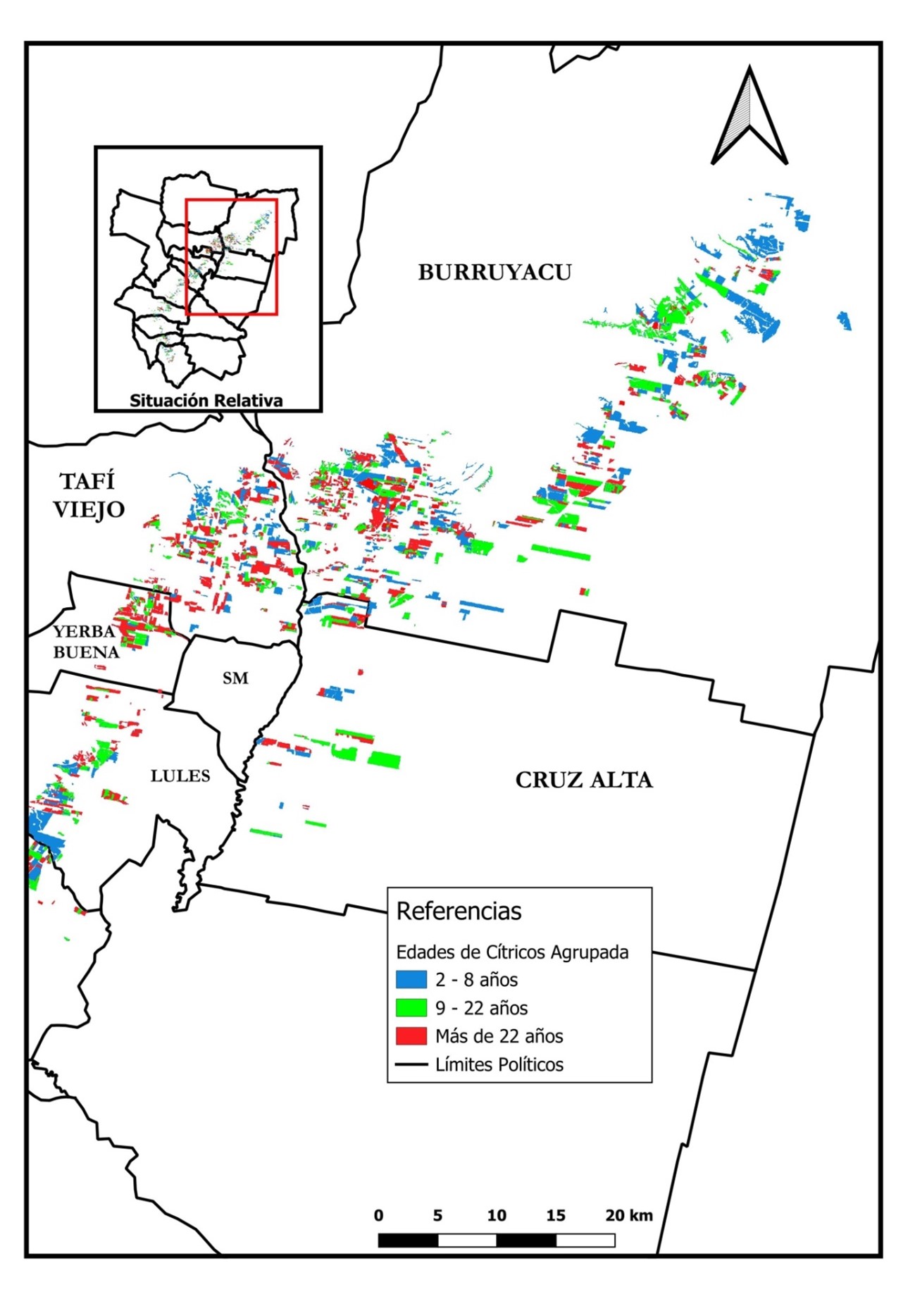 Las plantaciones citrícolas en Tucumán se encuentran en toda la zona del piedemonte. Mediante imágenes satelitales, que permiten tener una idea actualizada de su evolución, la sección Sensores Remotos y Sistemas de Información Geográfica (SIG) de la Estación Experimental Agroindustrial Obispo Colombres (Eeaoc) analizó las edades de las plantaciones citrícolas en esa área. En el informe técnico se presenta un estudio detallado sobre la estructura de edades de las plantaciones citrícolas en la provincia de Tucumán al cierre de 2025.