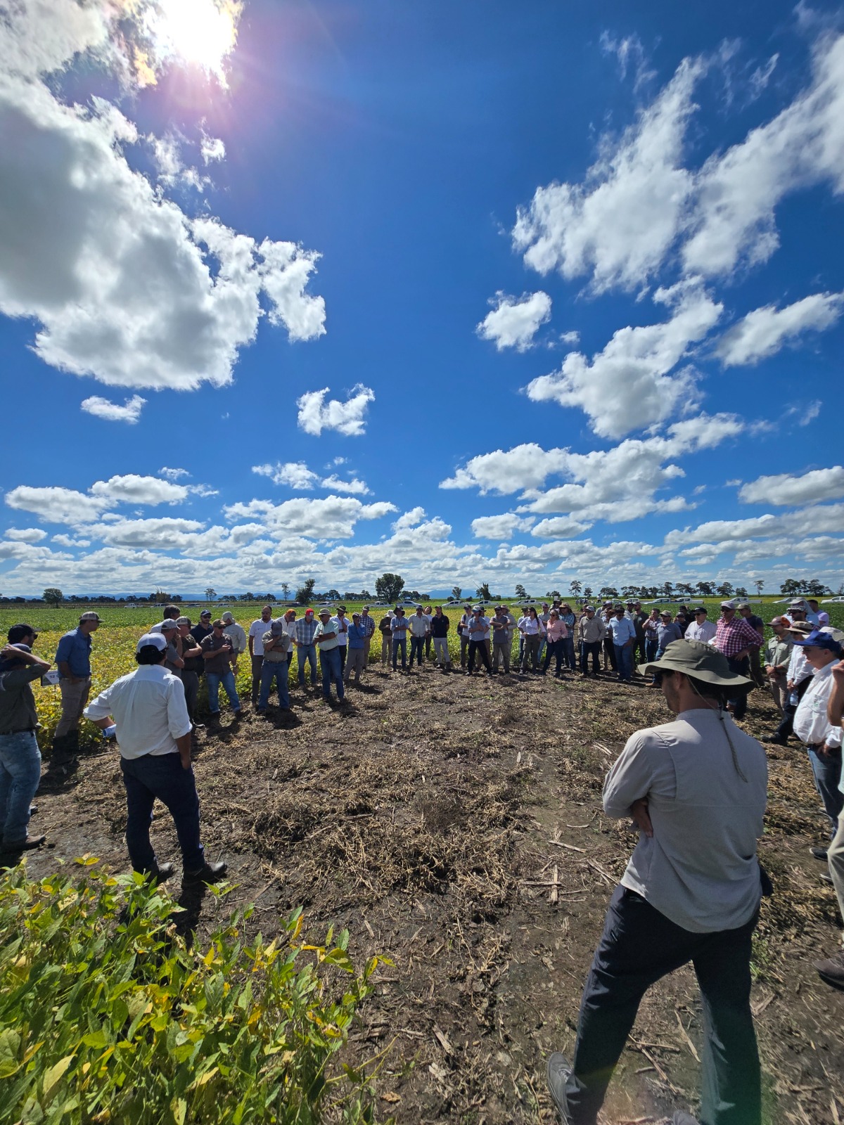 Durante la jornada se presentaron dos macroparcelas correspondientes a distintas fechas de siembra: una del 16 de diciembre de 2025 y otra del 6 de enero de 2026. En ambas se utilizó como testigo una variedad de GM VI con tecnología Conkesta, En la primera fecha de siembra se mostraron 18 variedades, mientras que en la segunda fecha se incluyeron 12 materiales. Las variedades ensayadas abarcaron un amplio rango de grupos de madurez, desde GM 5.9 hasta GM 8.2, incluyéndose materiales Conkesta, Enlist y RR1. Las macroparcelas contaron con la participación de importantes semilleros, entre ellos Don Mario, Neogen, Brevant, Pioneer, Credenz, Lealsem y Nidera, quienes aportaron las principales características de los materiales evaluados.