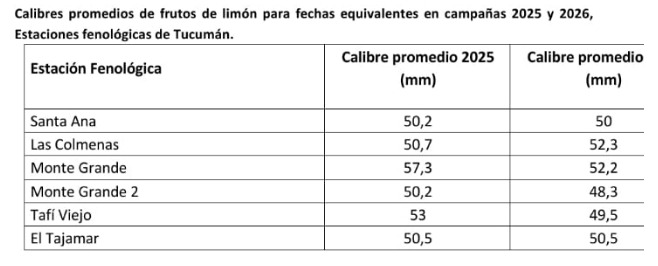 Calibres promedios de frutos de limón para fechas equivalentes en campañas 2025 y 2026, Estaciones fenológicas de Tucumán.