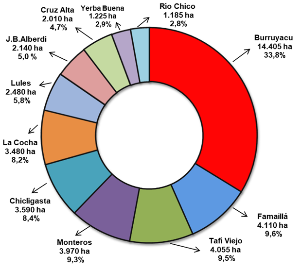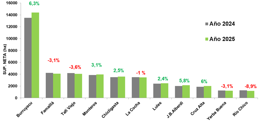 A nivel territorial, se identificó que el departamento Burruyacu lidera la superficie implantada tanto en limón como en cítricos dulces, registrando además el mayor aumento de área en nuevas hectáreas (6,3%). Por el contrario, hemos constatado descensos en la superficie de cinco departamentos, siendo Famaillá (3,1%) y Tafí Viejo (3,6%) los que presentaron las mayores reducciones.